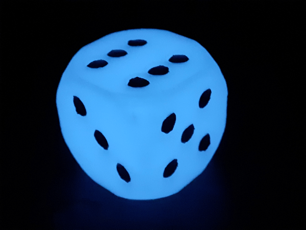 Magnes na lodówkę w kształcie kości do gry, świecące w ciemności.